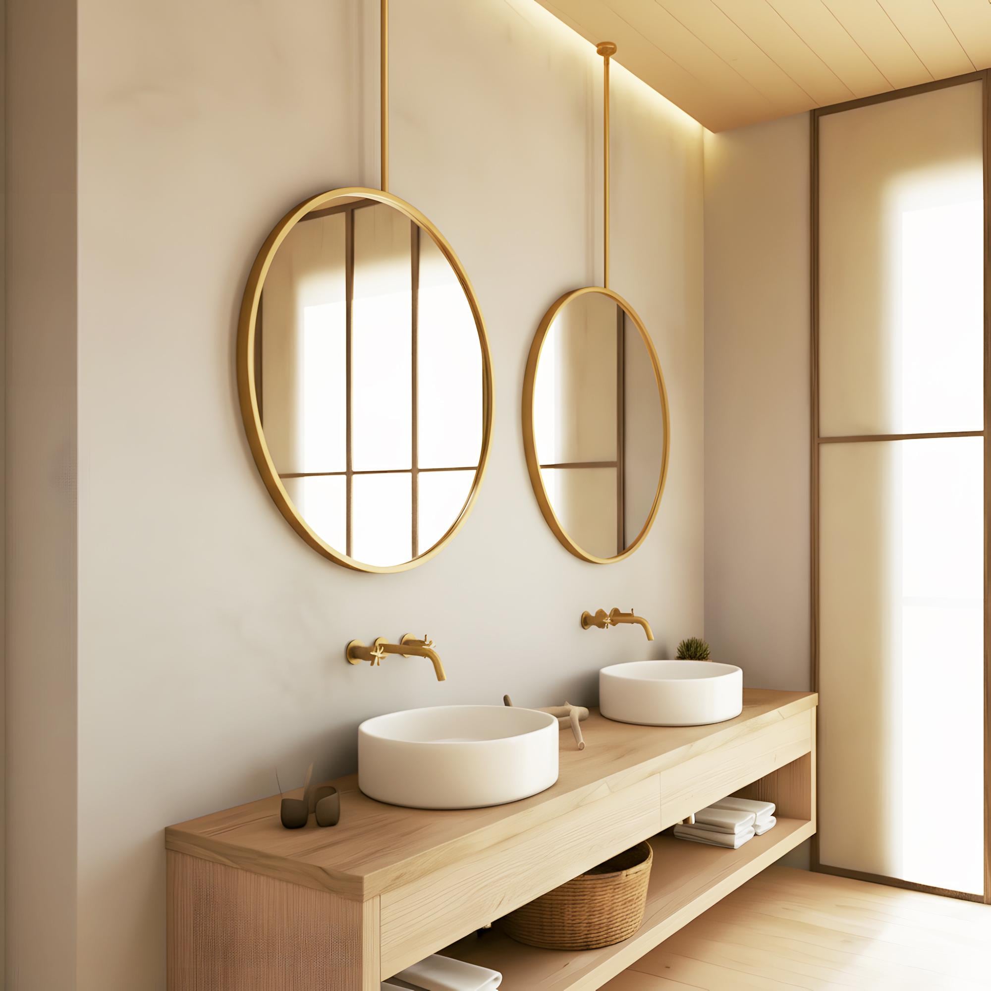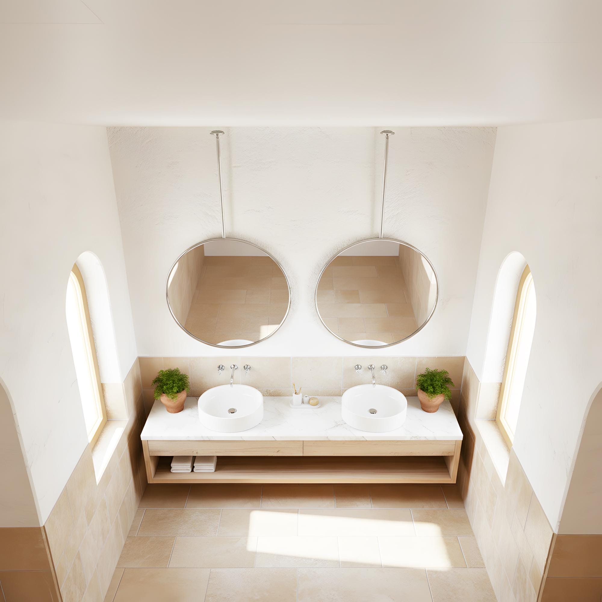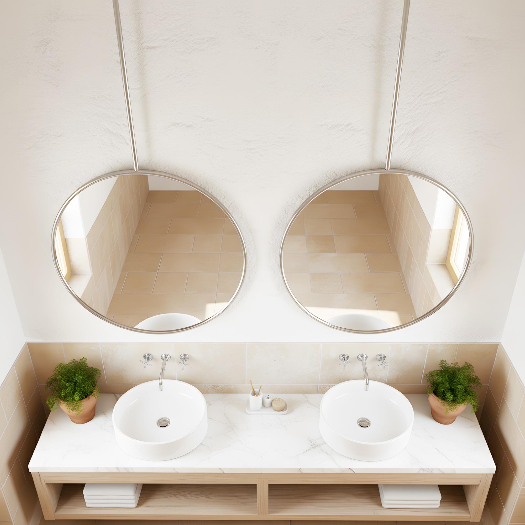 This mirror is mounted from the ceiling, making it ideal for bathrooms, double vanities, dressing areas, and interior design projects.