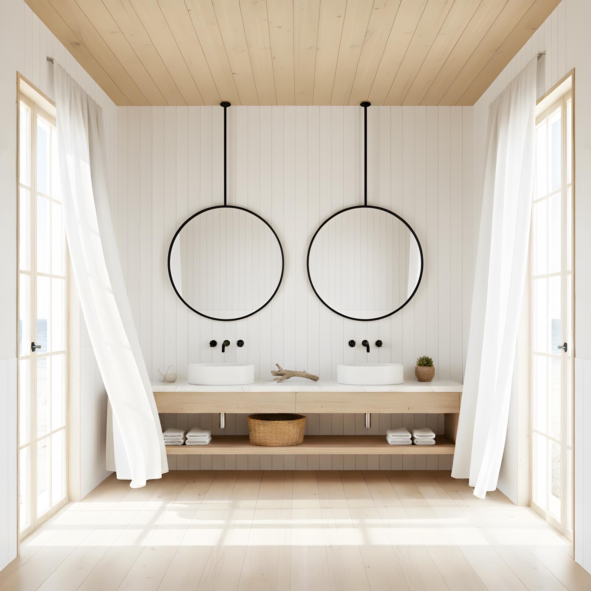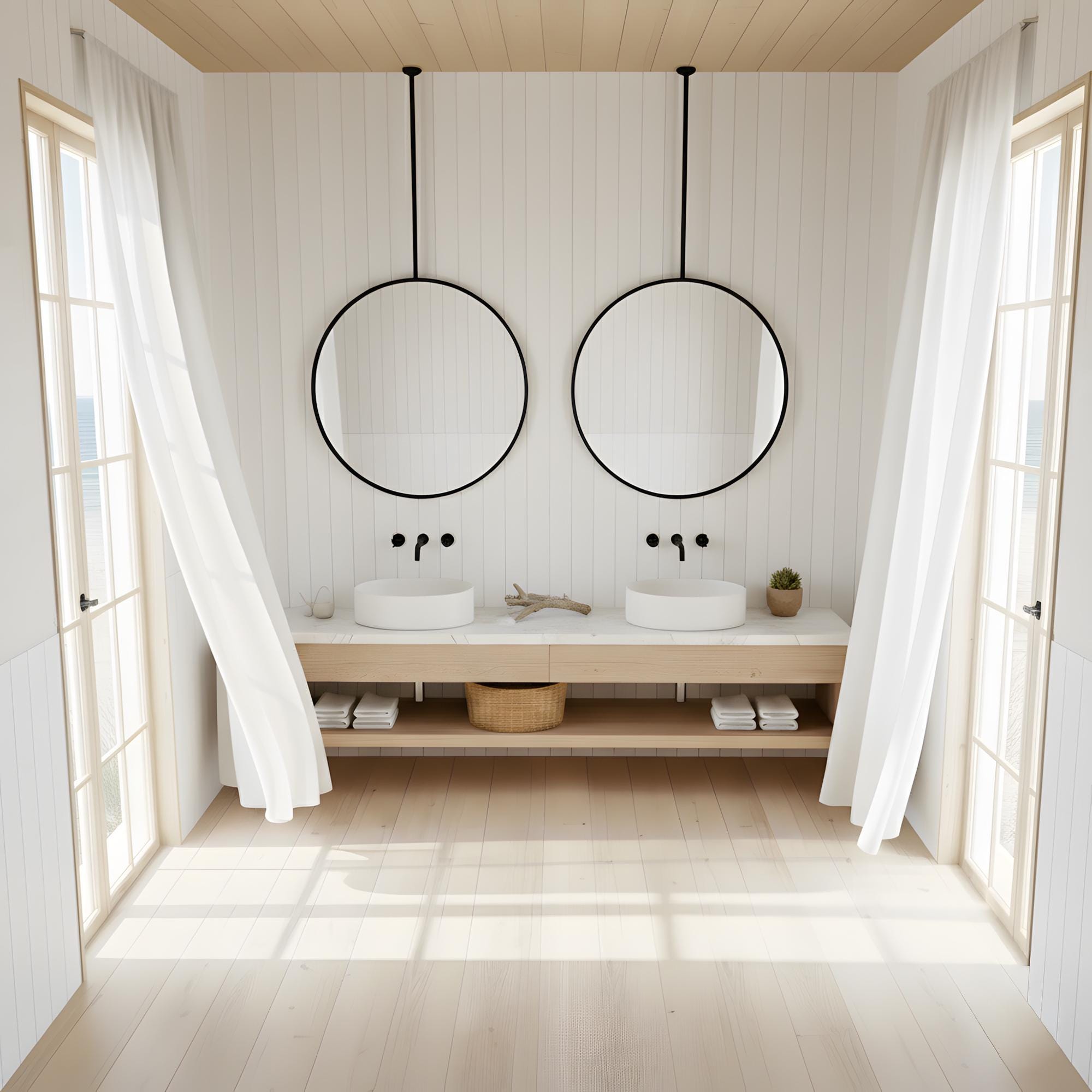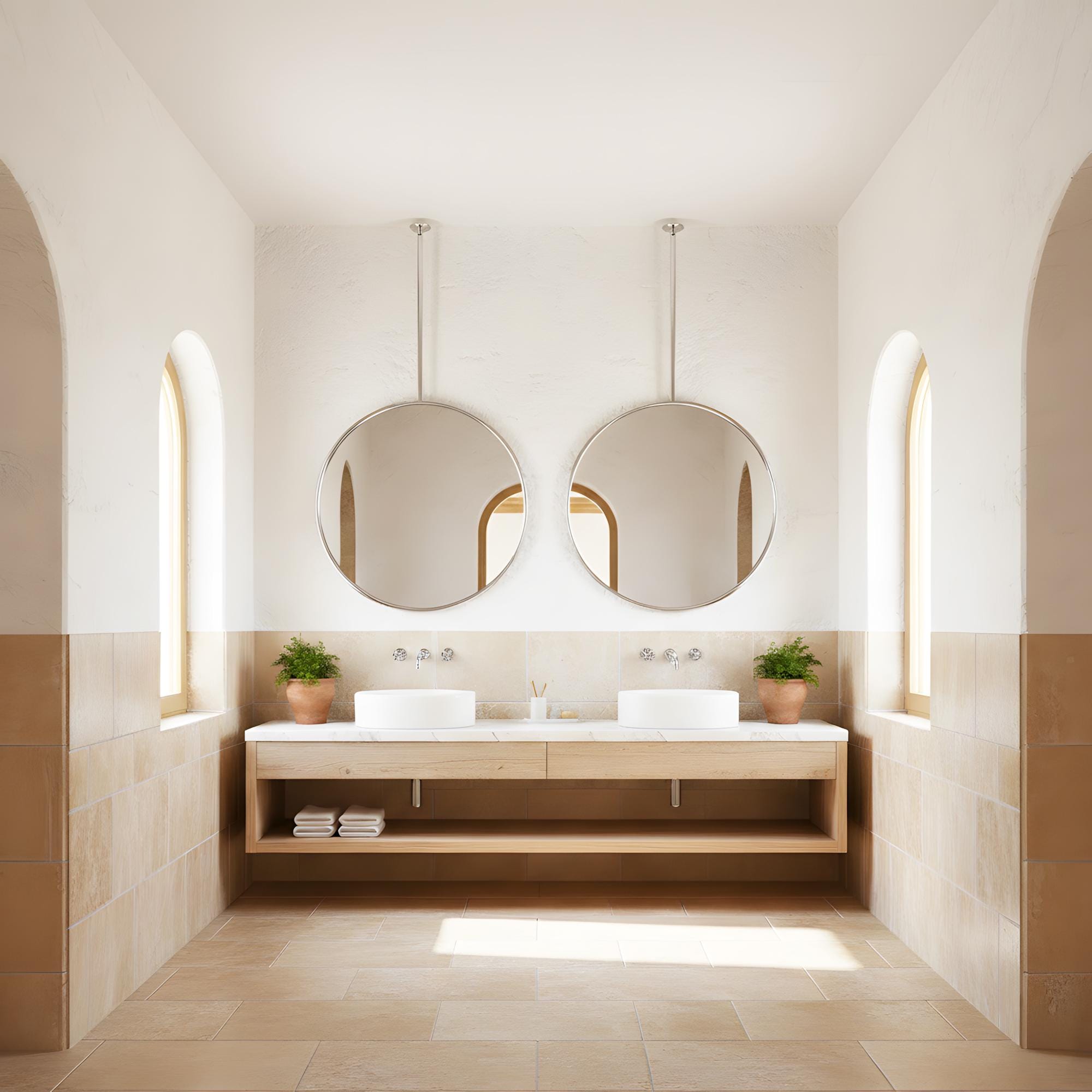This mirror is mounted from the ceiling, making it ideal for bathrooms, double vanities, dressing areas, and interior design projects.