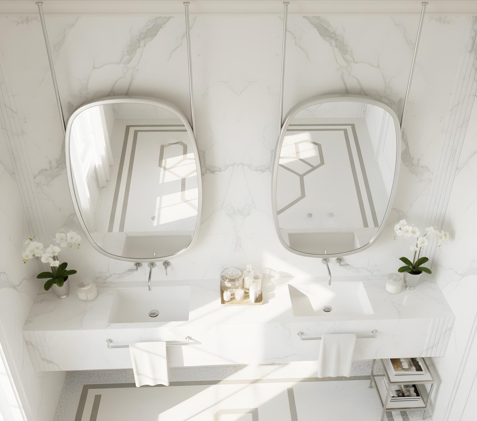 Bring a touch of modern elegance to your bathroom with this beautifully crafted ceiling-mounted mirror featuring a smooth, organic metal frame. Designed to elevate contemporary interiors, this mirror offers a unique suspended look that adds depth, sophistication, and architectural charm to any space.