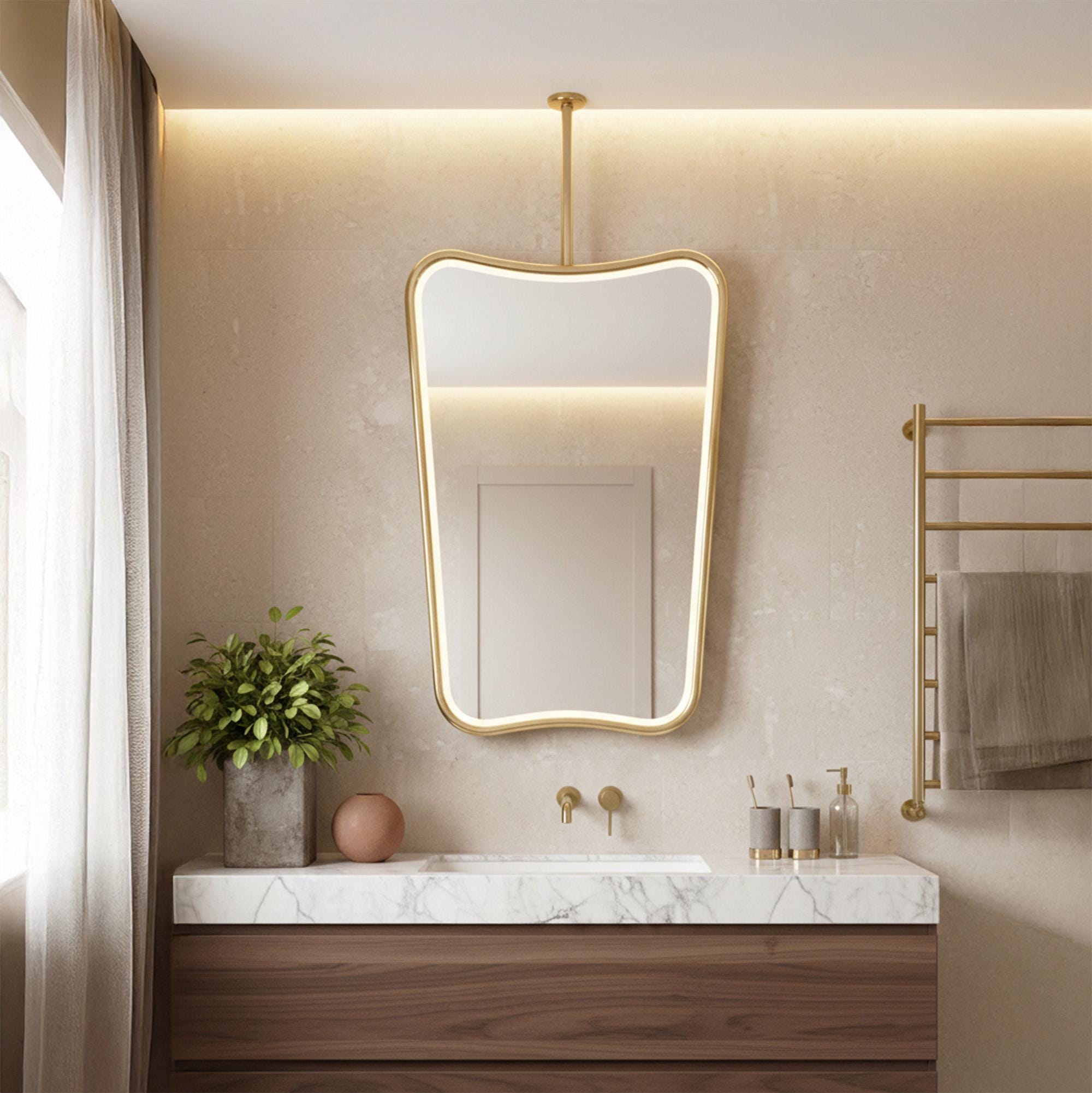 Bring elegance and modern design together with this gold metal framed oval mirror, the perfect statement piece for your bathroom or living space. Its ceiling-mounted structure creates a refined and spacious atmosphere while adding a luxurious touch to your home.