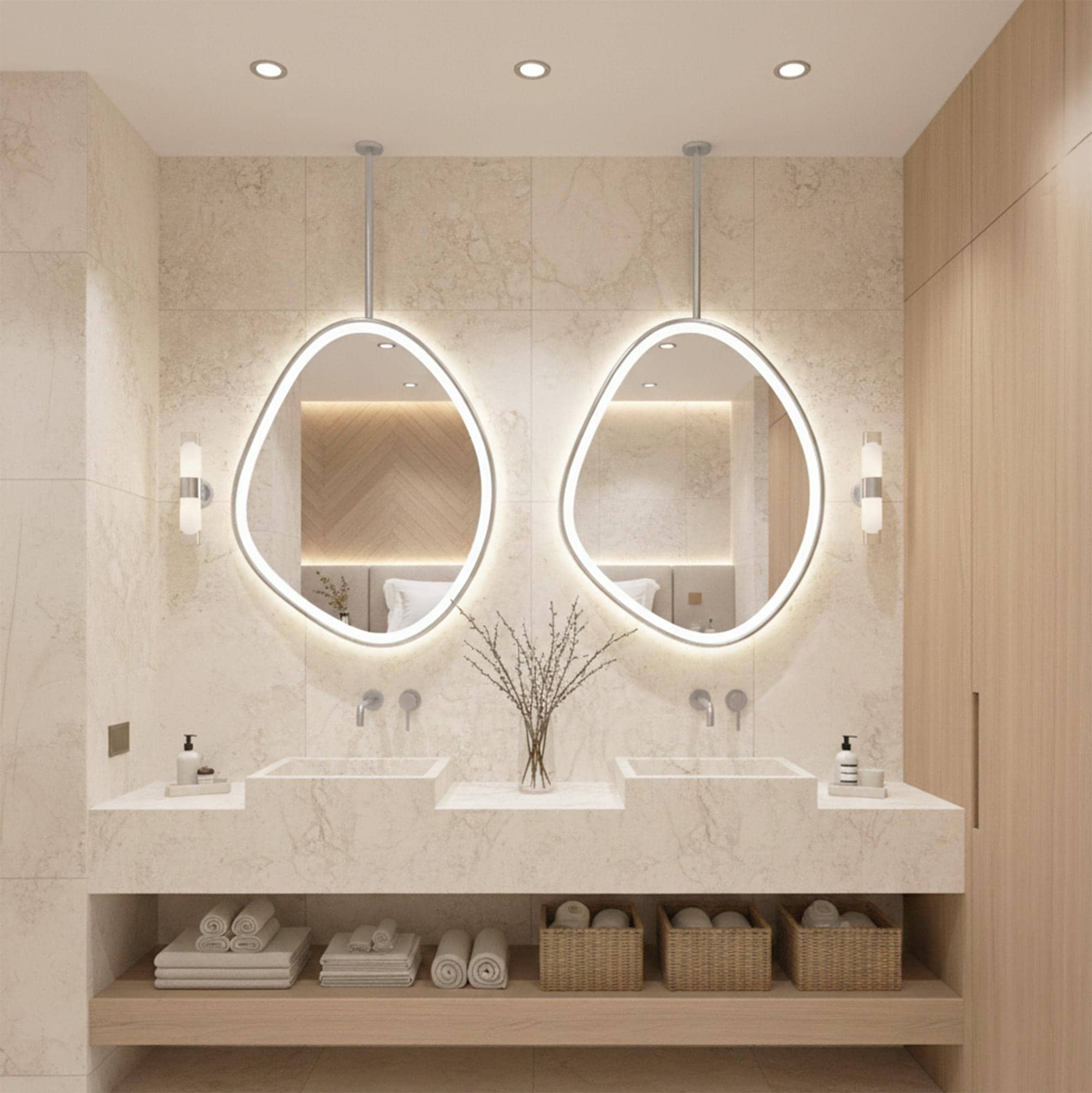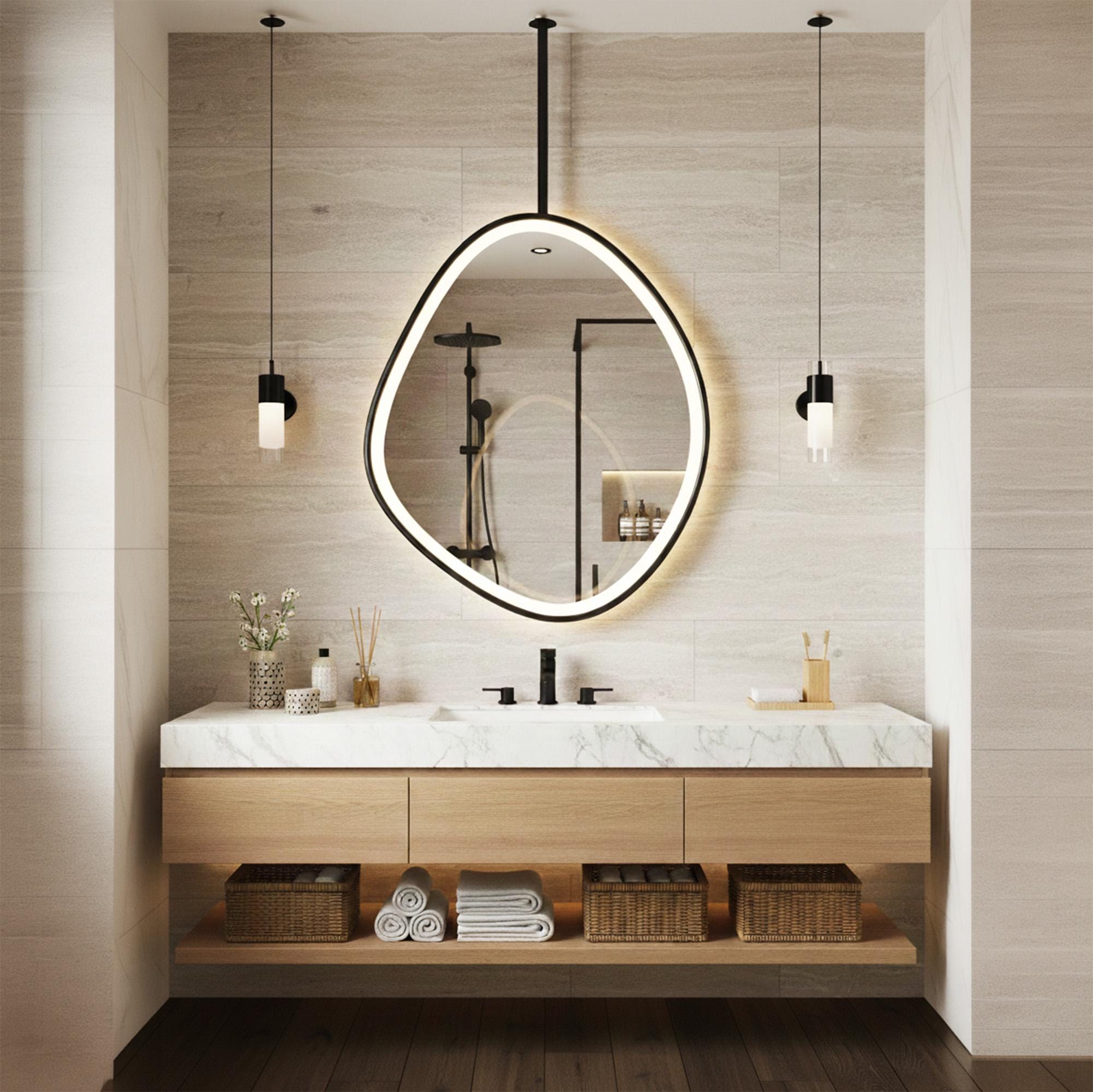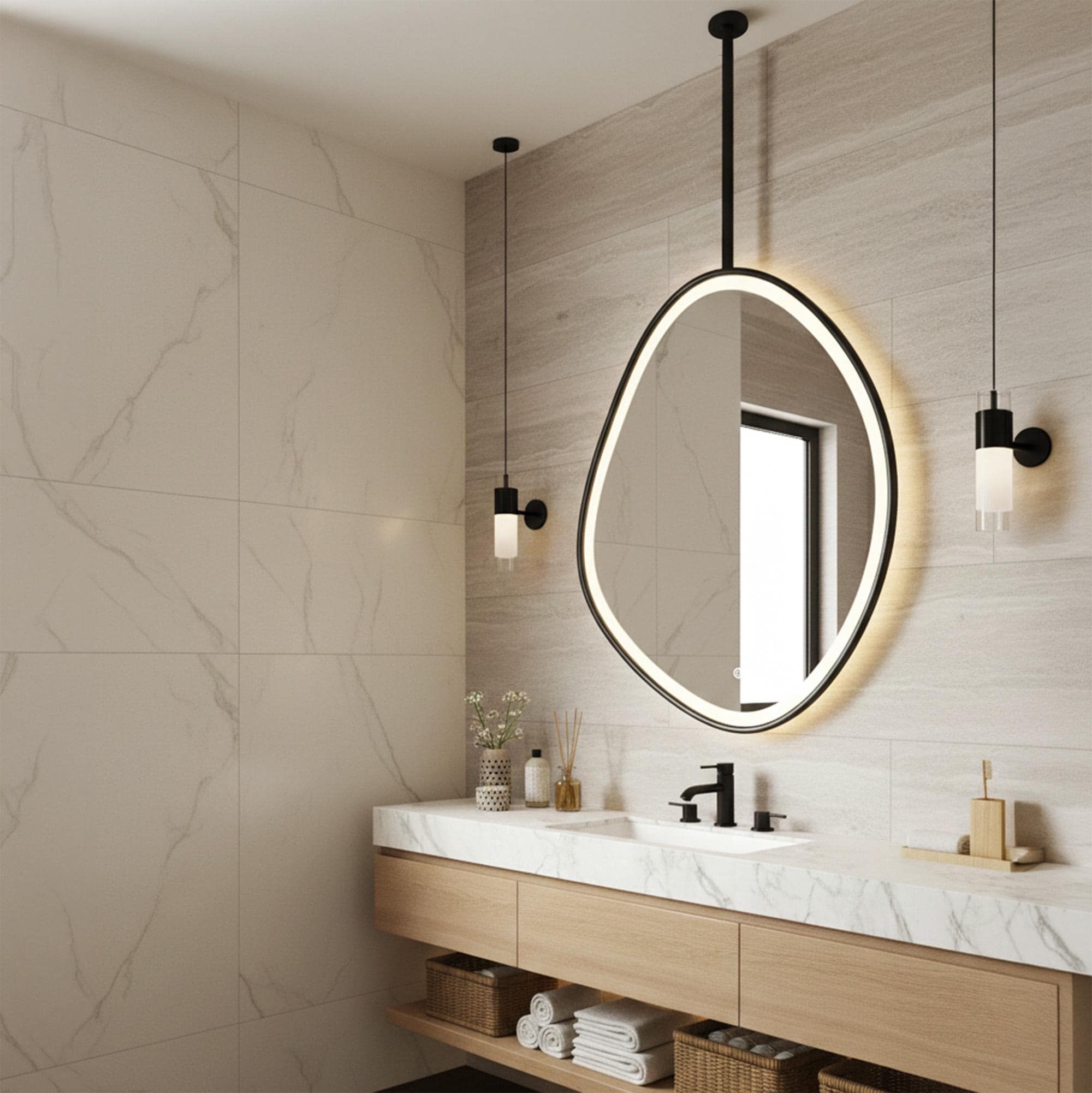 Asymmetrical Ceiling Mounted LED Mirror – Modern Metal Frame Hanging Bathroom Mirror