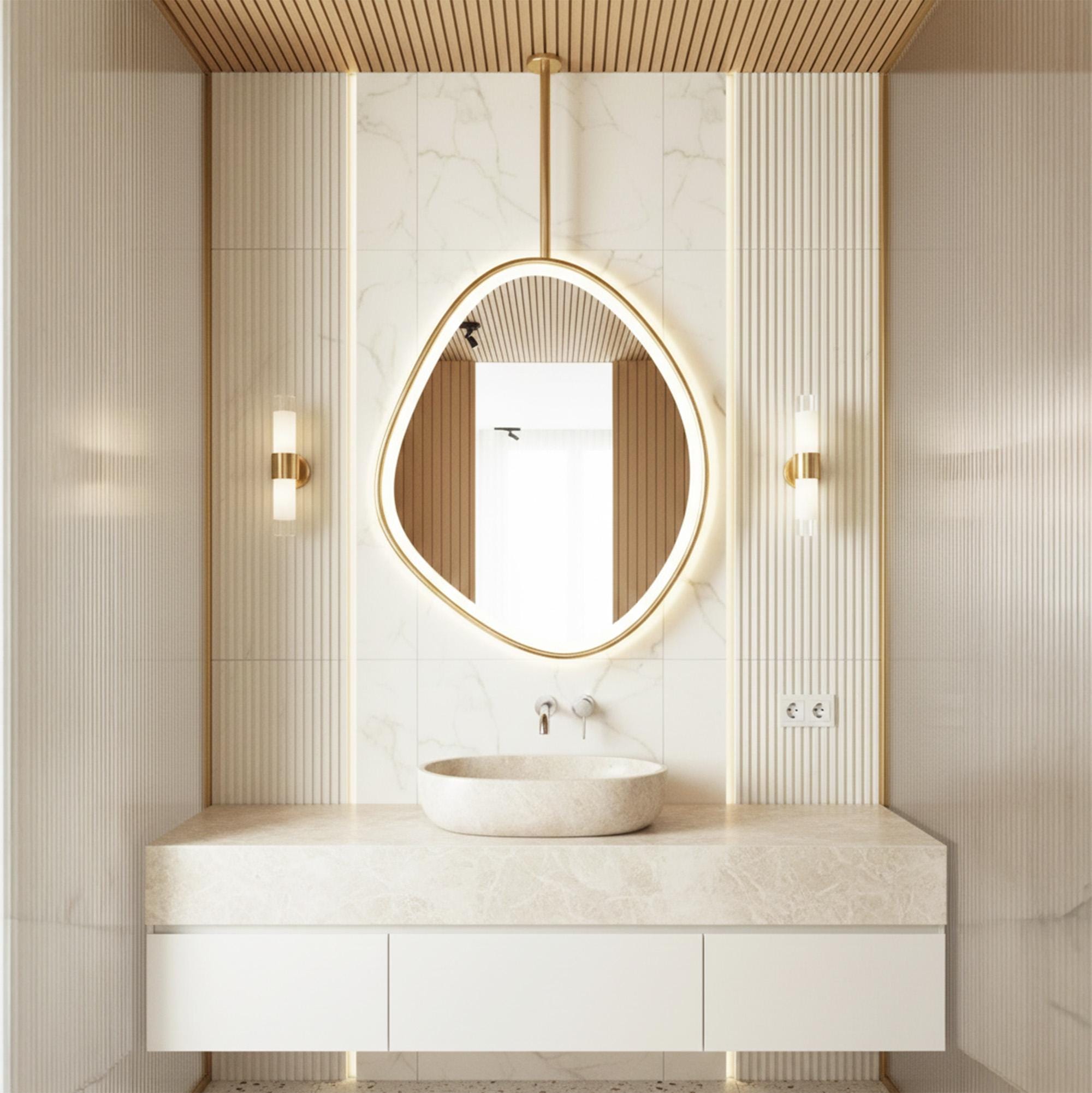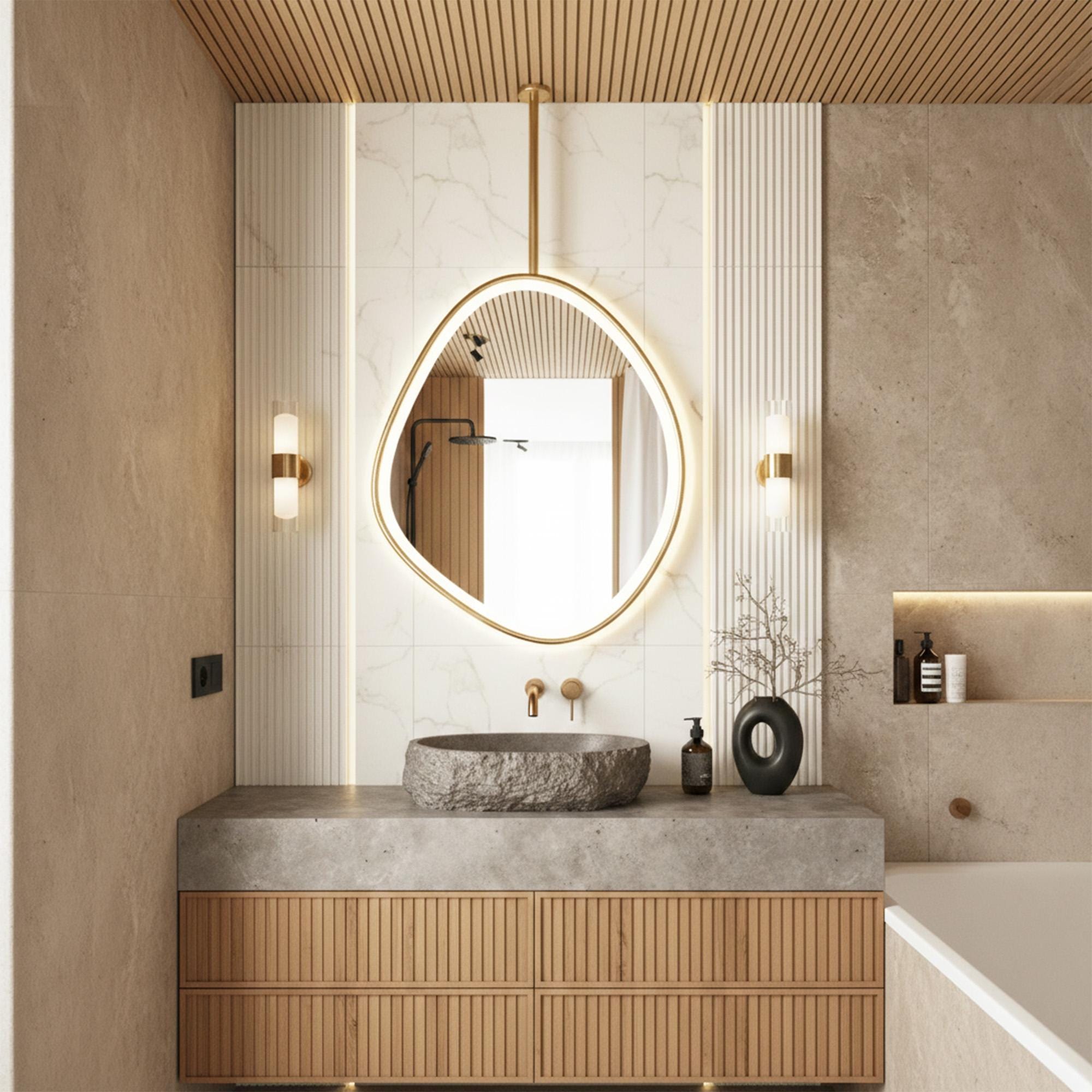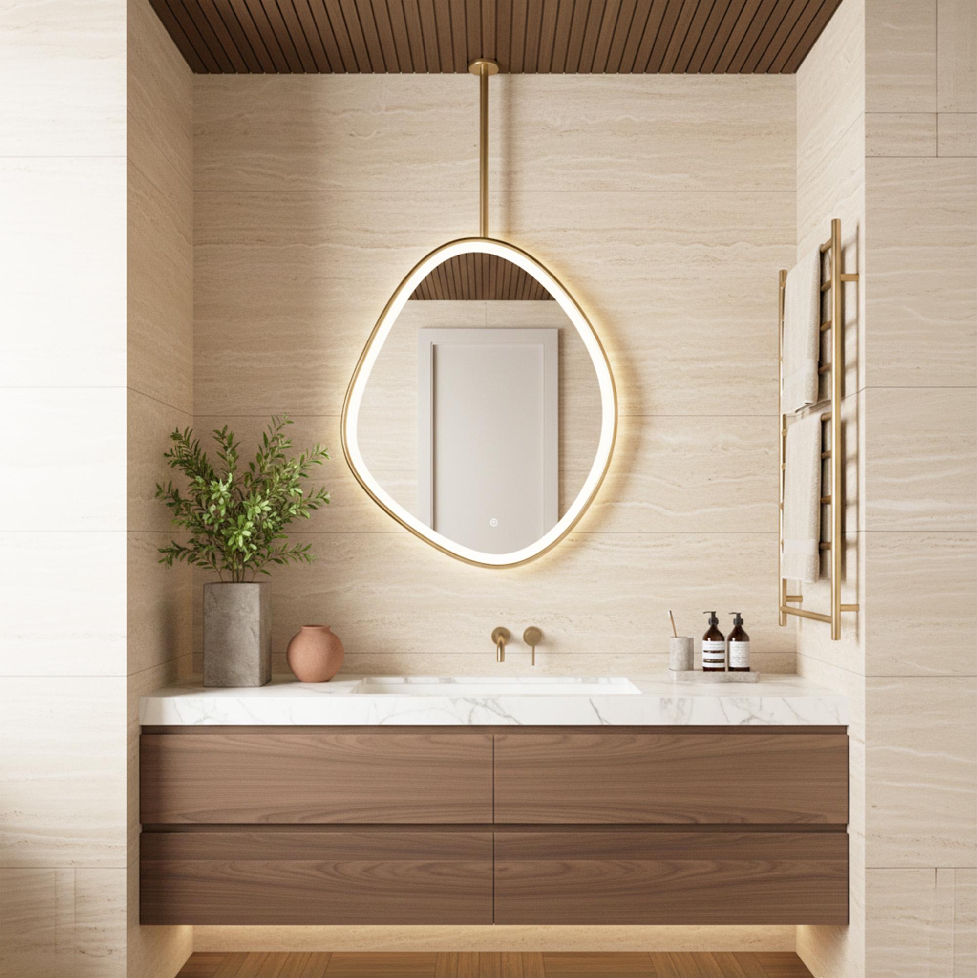 Asymmetrical Ceiling Mounted LED Mirror – Modern Metal Frame Hanging Bathroom Mirror